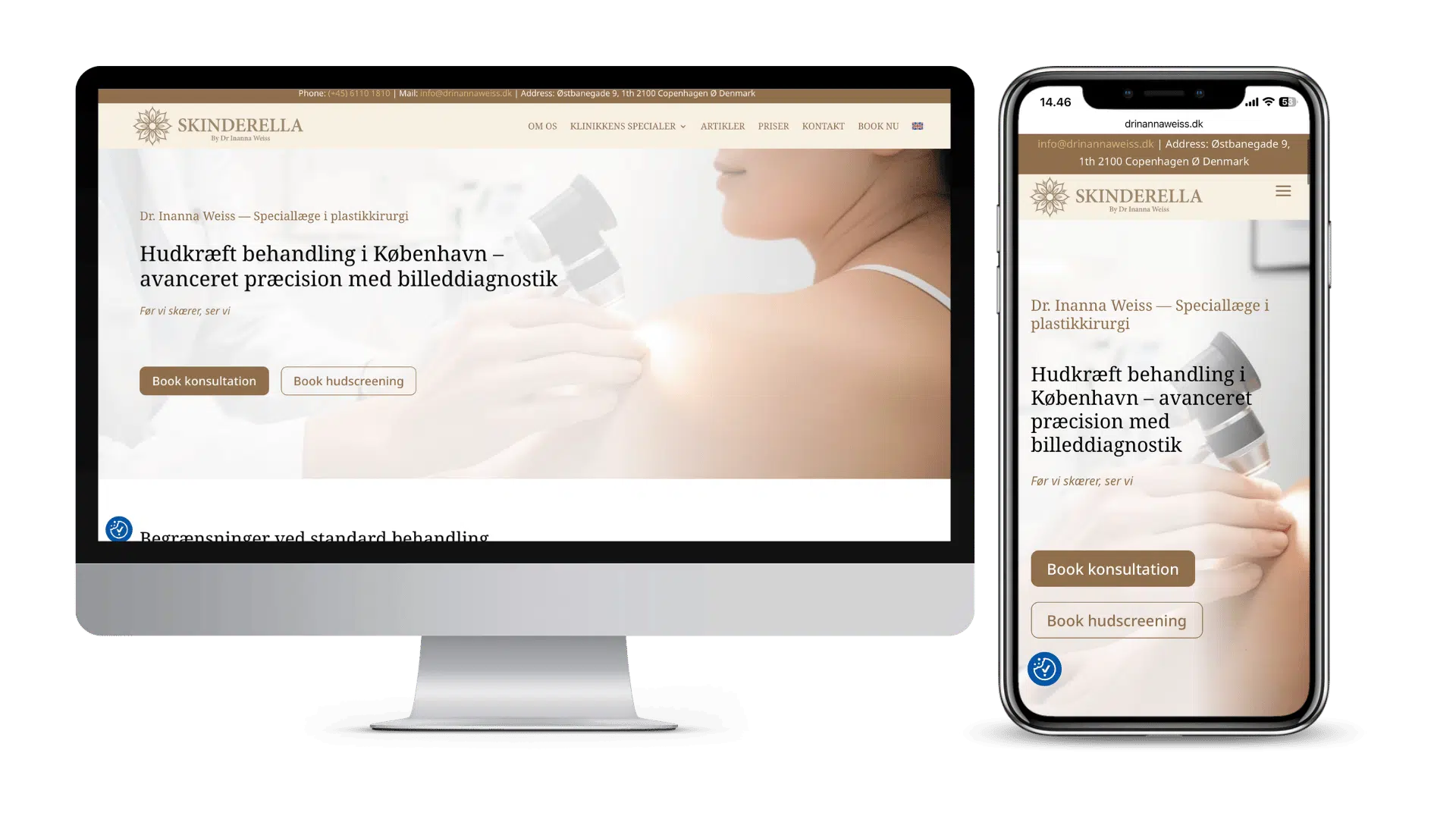 Professionel hjemmeside for Skinderella by Dr Inanna Weiss – plastikkirurgi og avanceret hudkræftkirurgi i København med integreret bookingsystem.